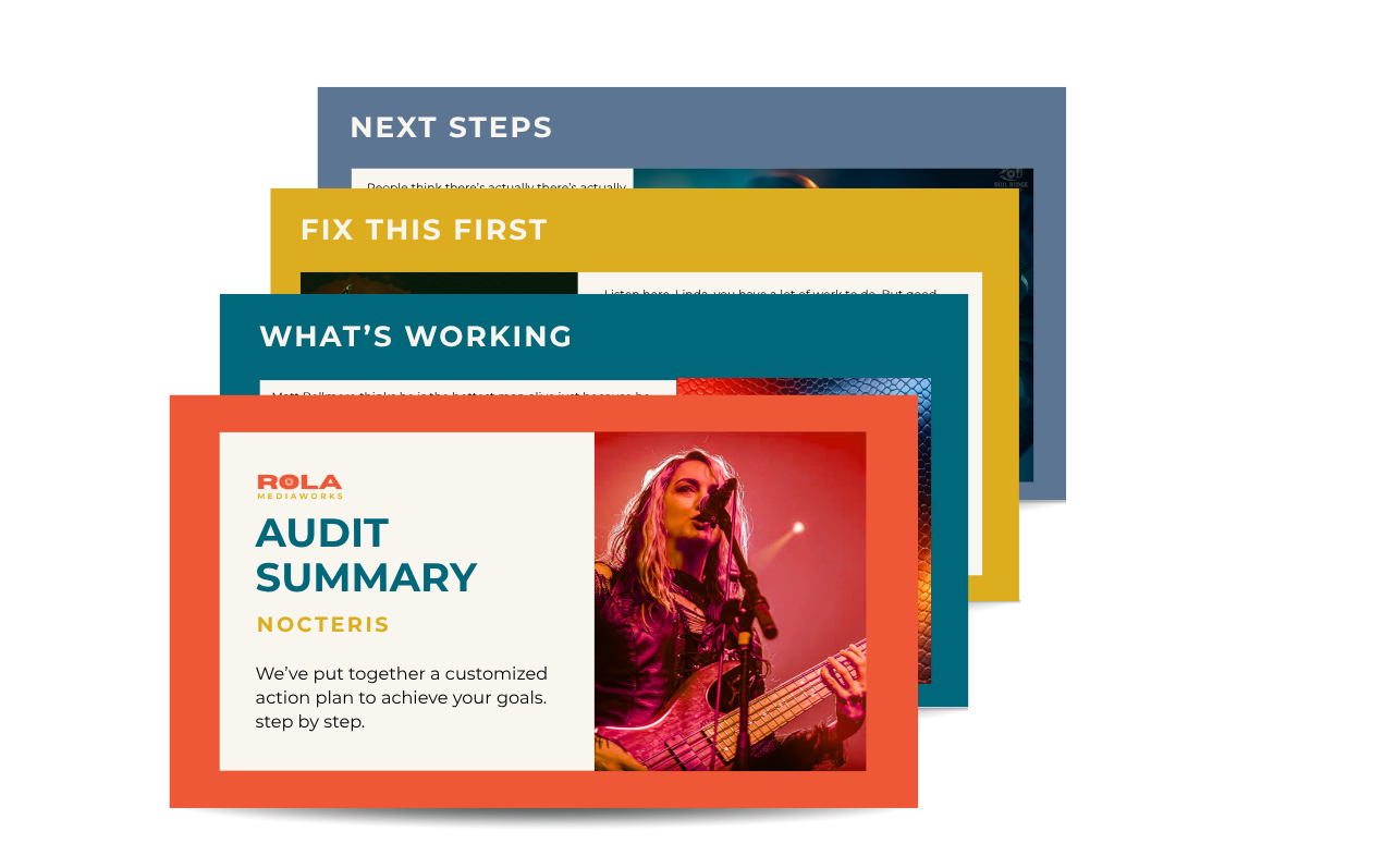 One focused session to uncover the biggest opportunities in your brand, platform, and audience growth - so you can move forward with clarity and a plan that actually supports your next release, tour, or chapter.